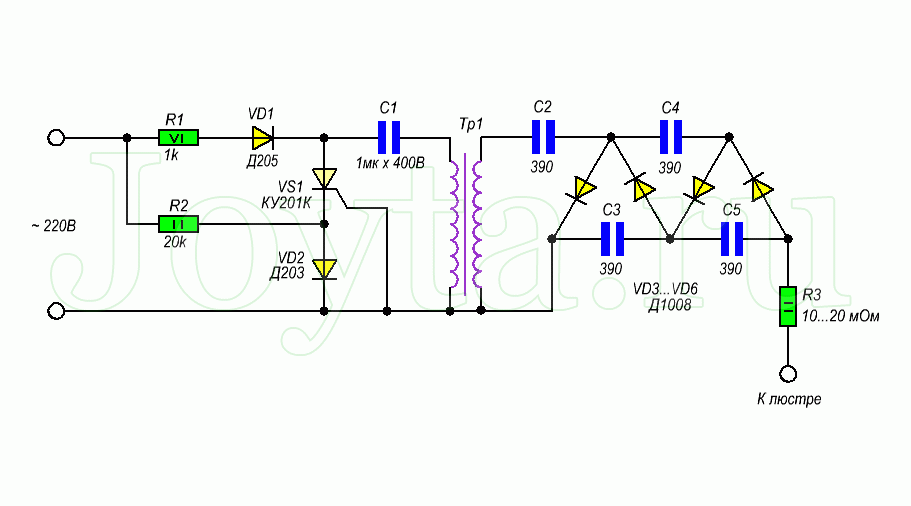 - Высокое напряжение с третьей обмотки идет на умножитель из конденсаторов С8-С13 и диодов VD5-VD10.