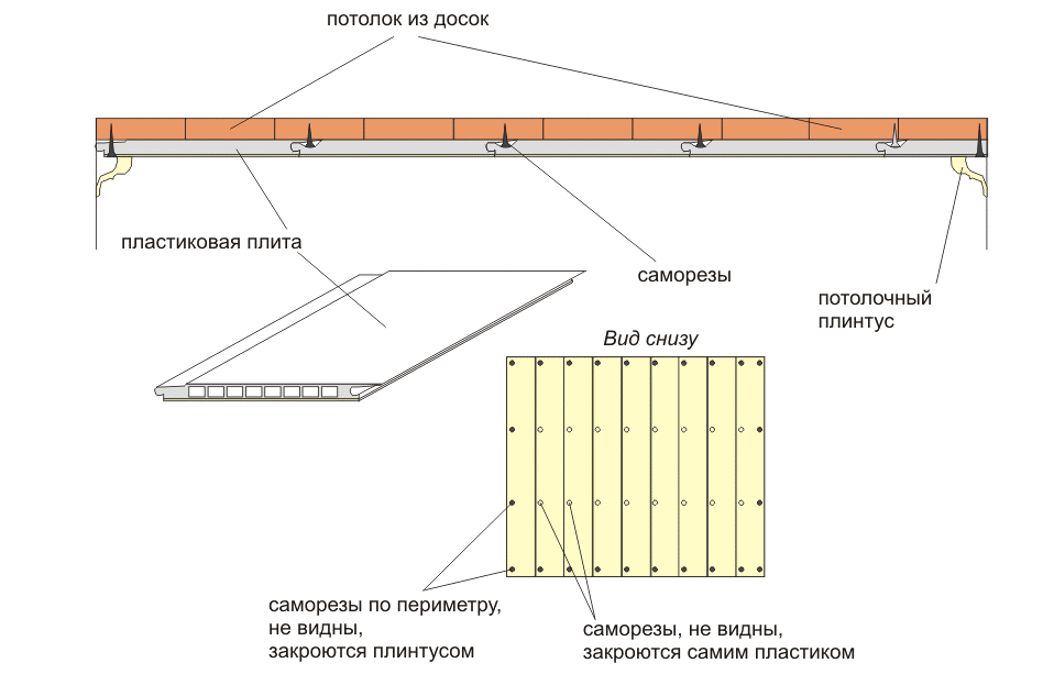 Потолочные панели крепят на деревянный или металлический каркас, представляющий собой рейки произвольного сечения с определенным шагом (расстояние между основными поперечными несущими конструкциями). Притом величина реек, на начальном этапе, не имеет принципиального значения (подойдут любые с одинаковой толщиной).