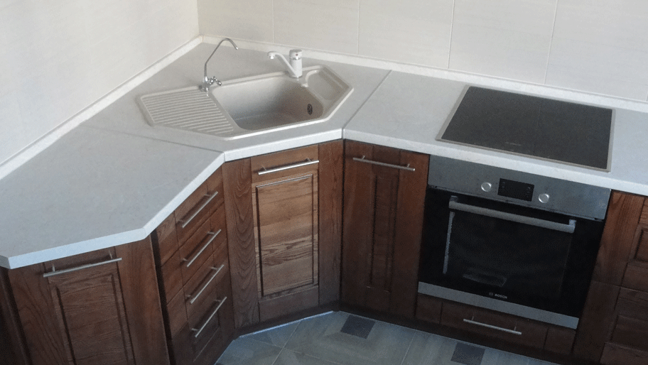 Чаще всего в углу располагают мойку. Также там может размещаться рабочая поверхность, которая может быть цельной или формироваться стыком двух тумбочек (тогда мойка находится по соседству)